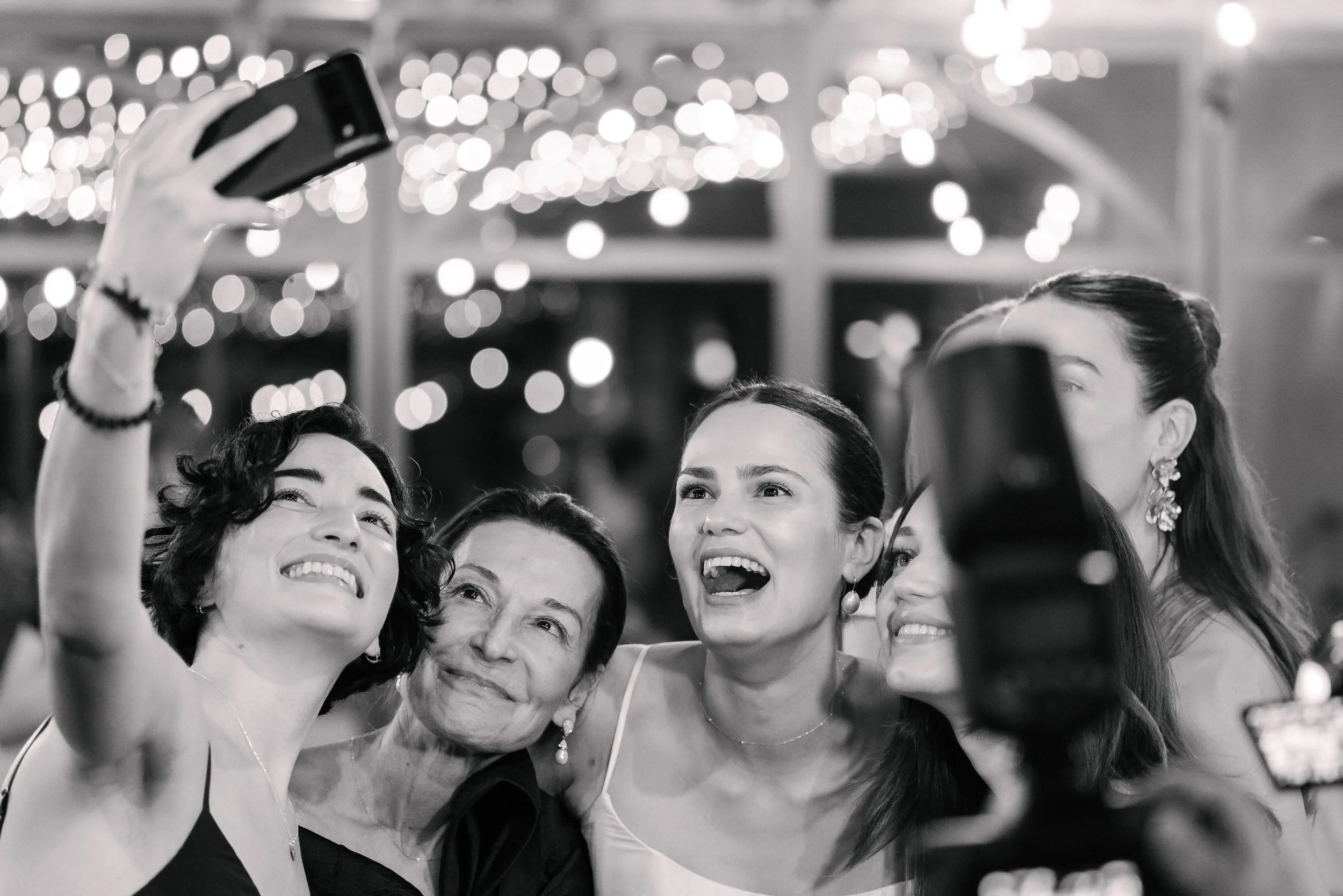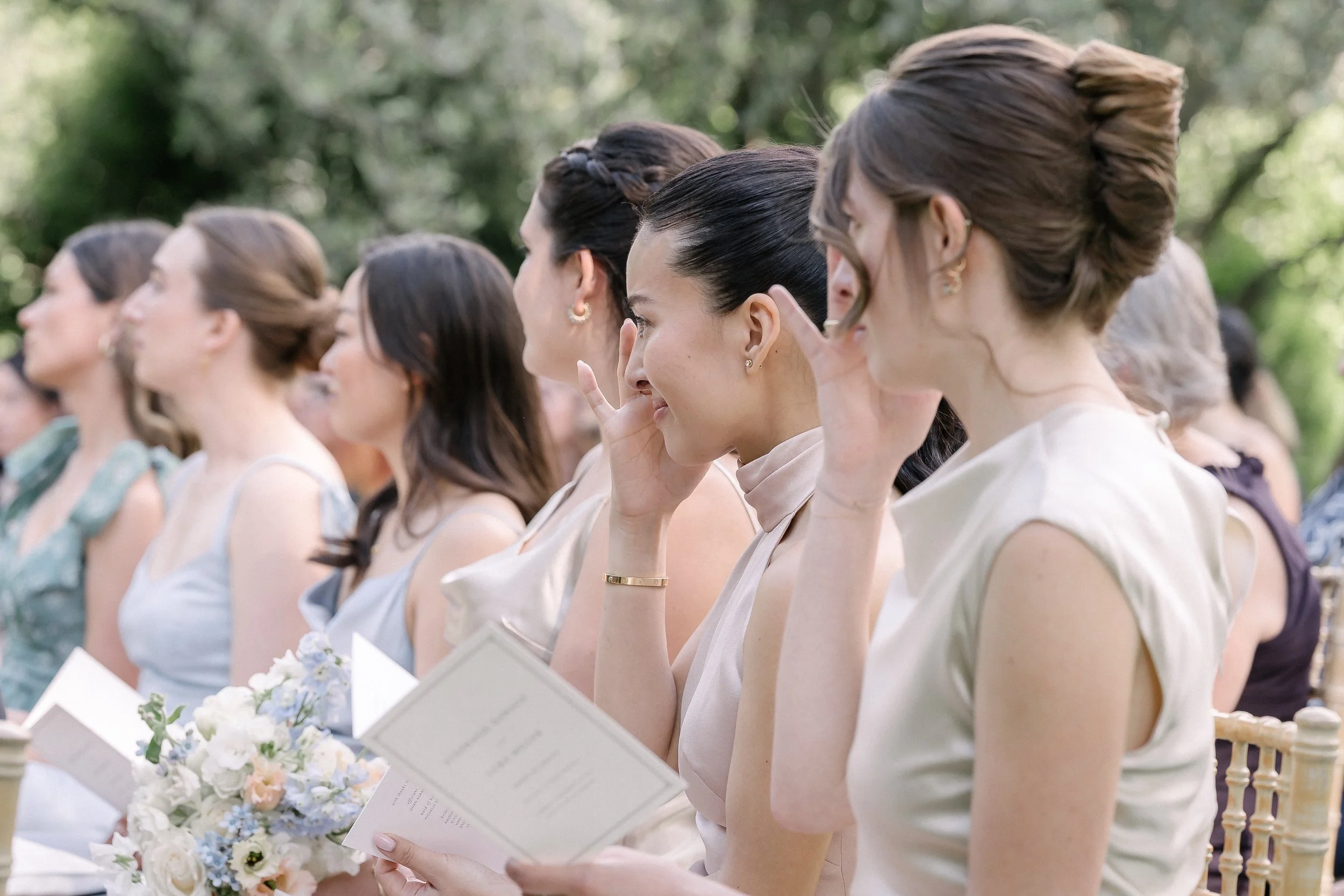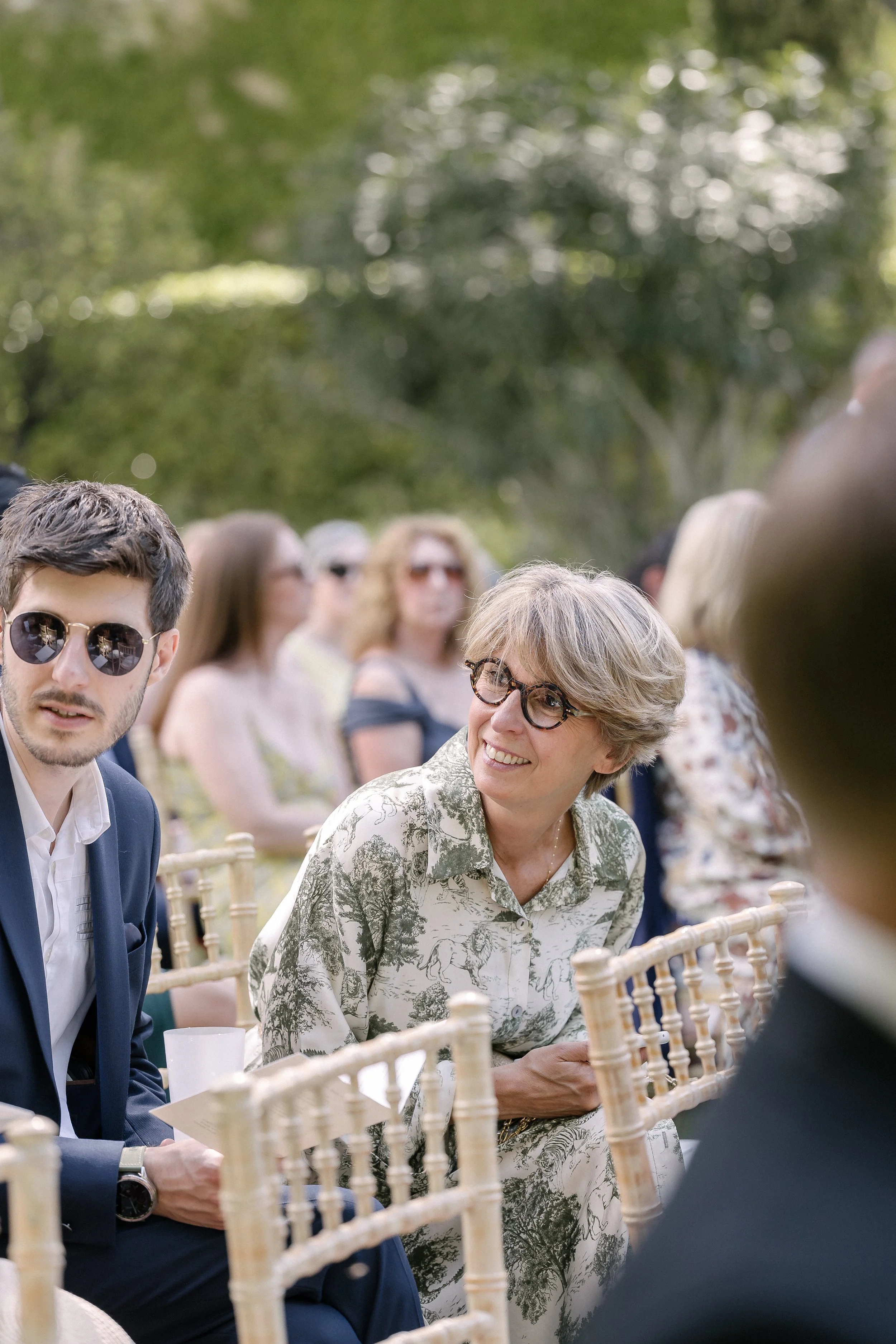 La cérémonieLa cérémonie s'est tenue dans le jardin de la Tour, sous les grands arbres. Les demoiselles d'honneur étaient assises au premier rang, en robes bleu ciel et champagne, bouquets de fleurs blanches sur les genoux.Il y avait quelque chose d'international dans l'assemblée — des visages venus d'ailleurs, des langues mélangées, une attention collective suspendue au même instant.Stéphanie et Luke se sont dit oui dans cet espace suspendu que crée la cérémonie — quand le monde extérieur s'arrête un moment, et que les seules choses qui existent sont les deux personnes qui se regardent.La soiréeLa nuit venue, la Tour s'est animée. La fête a pris le dessus sur le protocole, comme elle doit le faire. Stéphanie entourée de ses amies, riant, la tête penchée vers un téléphone — l'une de ces images qui n'appartient qu'à eux, et que je suis heureux d'avoir eu.C'est ça, au fond, ce que je cherche à faire : que dans vingt ans, en regardant ces photos, ils retrouvent exactement ce qu'ils ont ressenti ce jour-là.