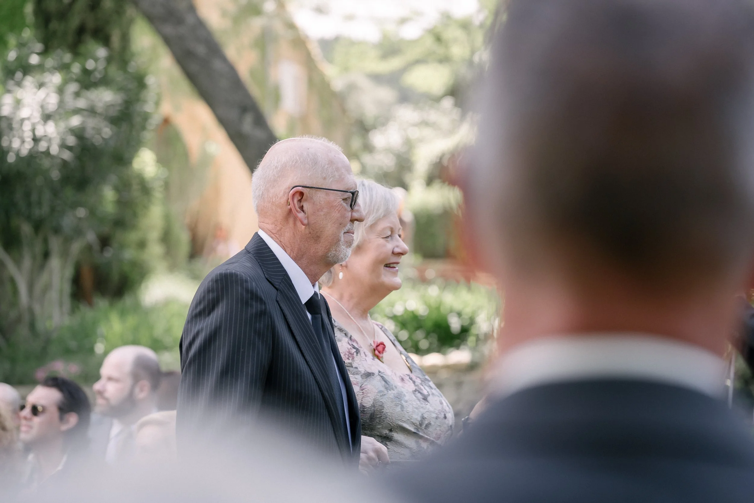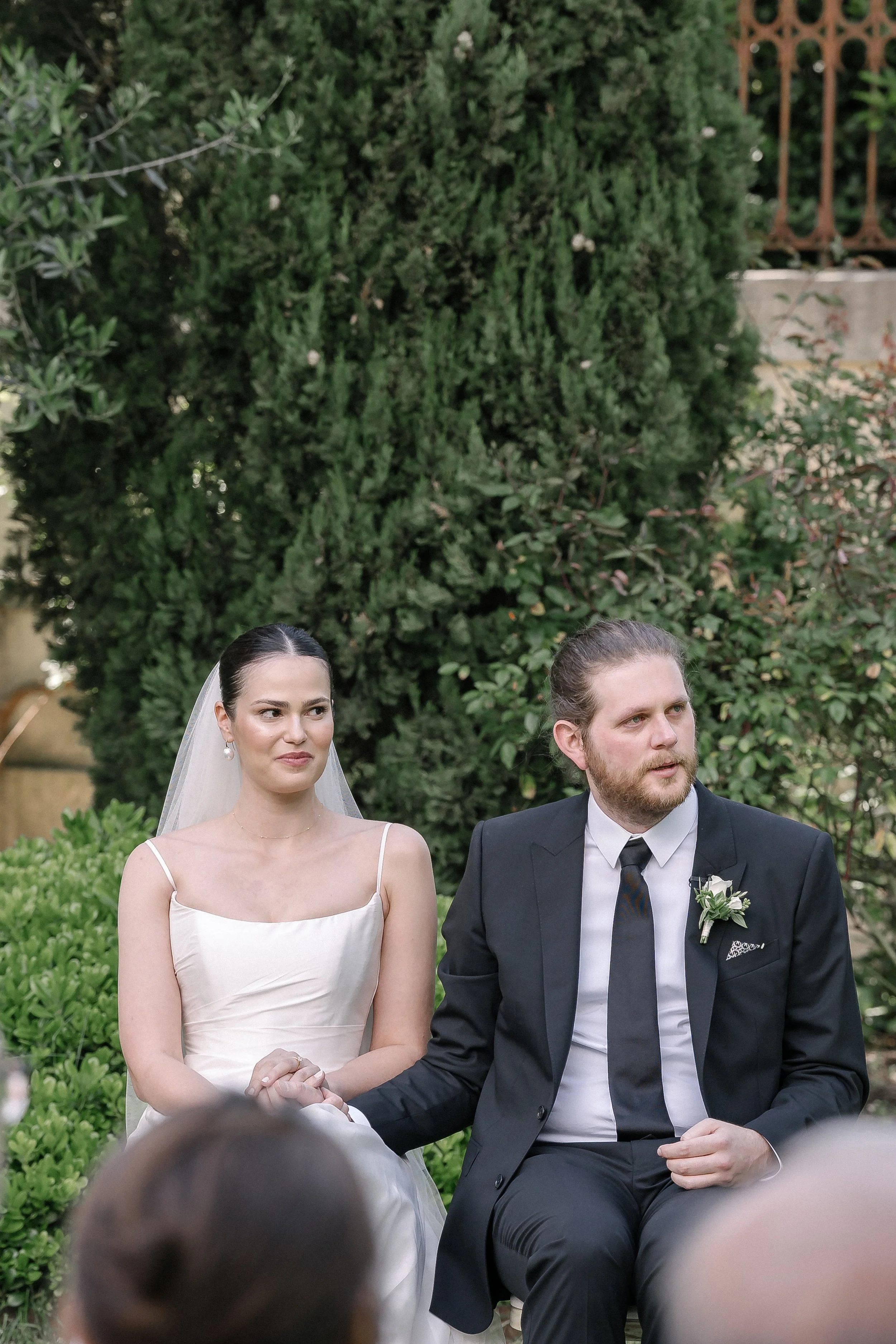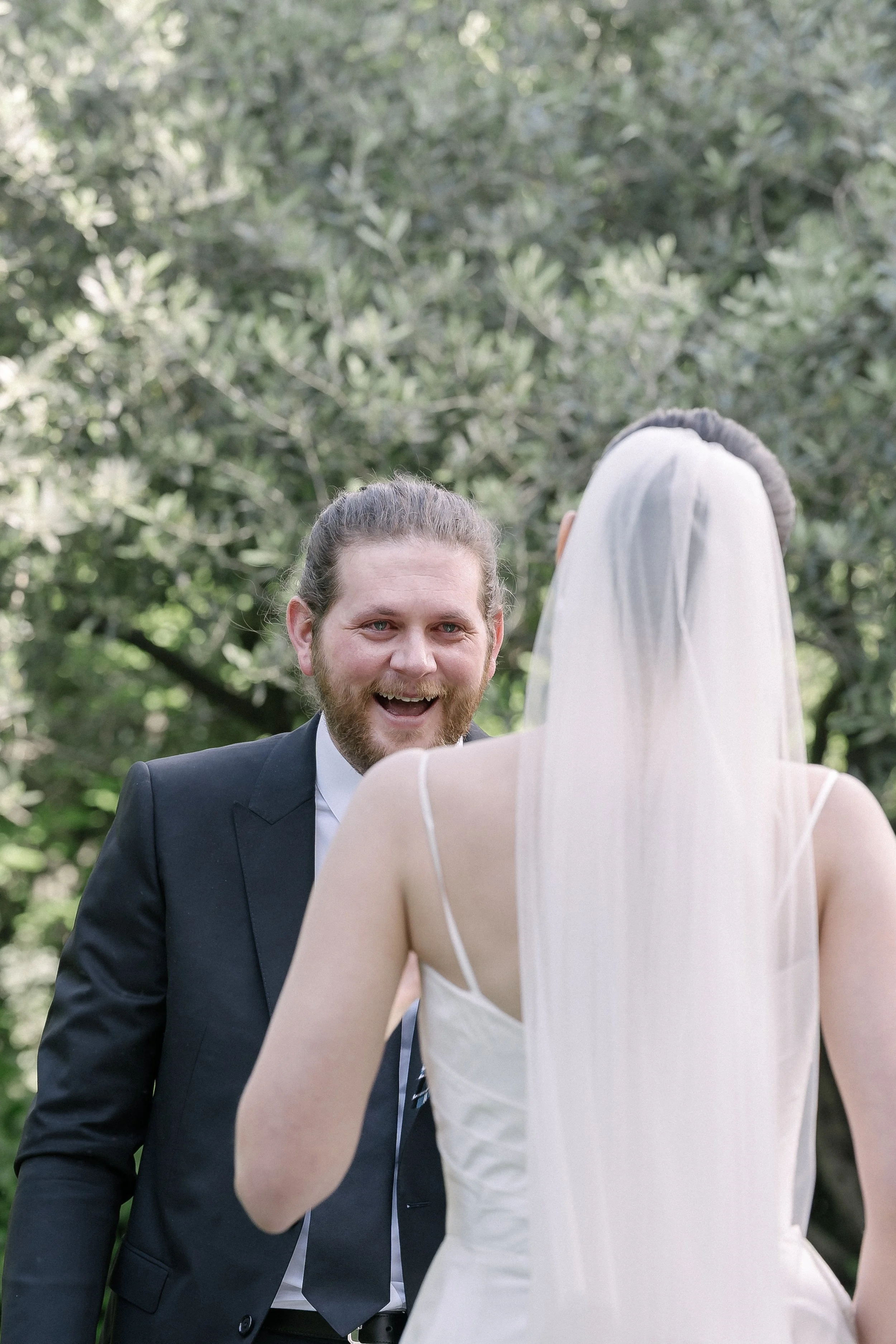 La cérémonieLa cérémonie s'est tenue dans le jardin de la Tour, sous les grands arbres. Les demoiselles d'honneur étaient assises au premier rang, en robes bleu ciel et champagne, bouquets de fleurs blanches sur les genoux.Il y avait quelque chose d'international dans l'assemblée — des visages venus d'ailleurs, des langues mélangées, une attention collective suspendue au même instant.Stéphanie et Luke se sont dit oui dans cet espace suspendu que crée la cérémonie — quand le monde extérieur s'arrête un moment, et que les seules choses qui existent sont les deux personnes qui se regardent.La soiréeLa nuit venue, la Tour s'est animée. La fête a pris le dessus sur le protocole, comme elle doit le faire. Stéphanie entourée de ses amies, riant, la tête penchée vers un téléphone — l'une de ces images qui n'appartient qu'à eux, et que je suis heureux d'avoir eu.C'est ça, au fond, ce que je cherche à faire : que dans vingt ans, en regardant ces photos, ils retrouvent exactement ce qu'ils ont ressenti ce jour-là.